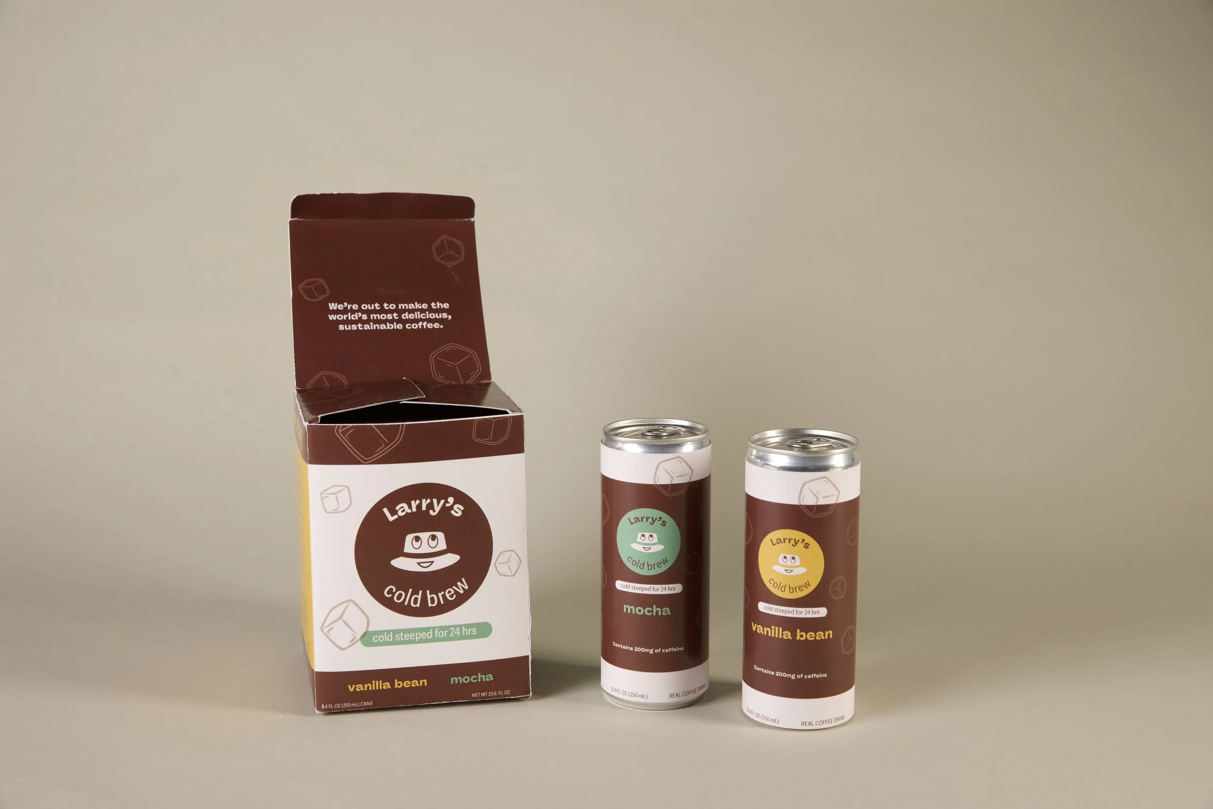 This packaging is a reimagining of a cold brew beverage from a coffee shop (Larry’s Coffee) located in Raleigh, North Carolina. The new logo still features the hat from the original logo and it formed into a character that is more lively and interactive throughout the packaging.
